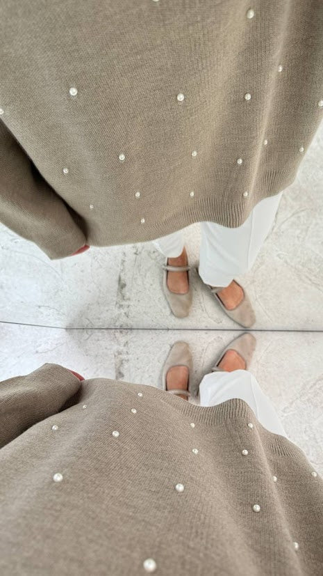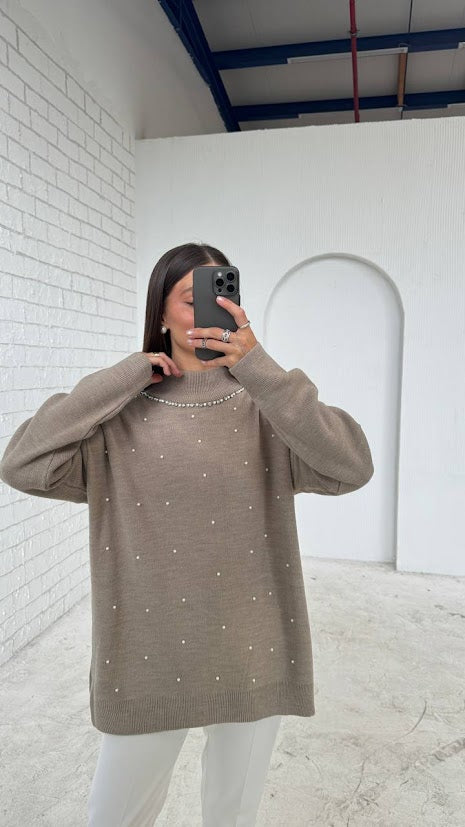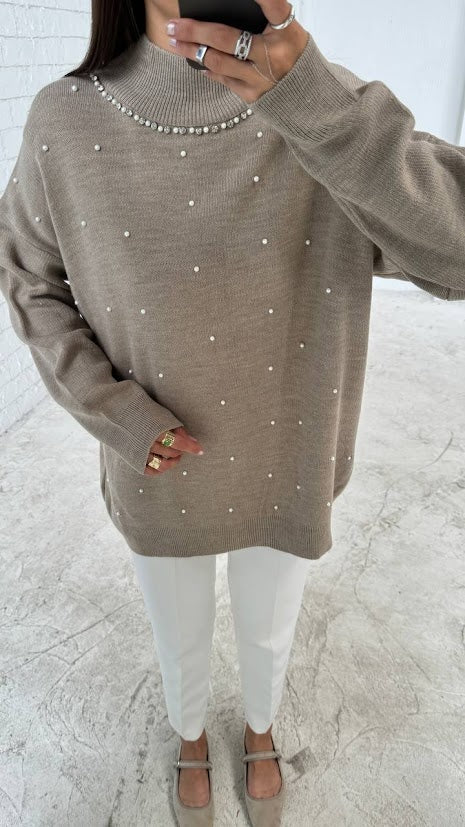 Effortless elegance with this chic beige oversized sweater adorned with delicate pearl detailing. The soft knit fabric drapes comfortably, offering both warmth and style, perfect for a cozy day out or a casual work setting.